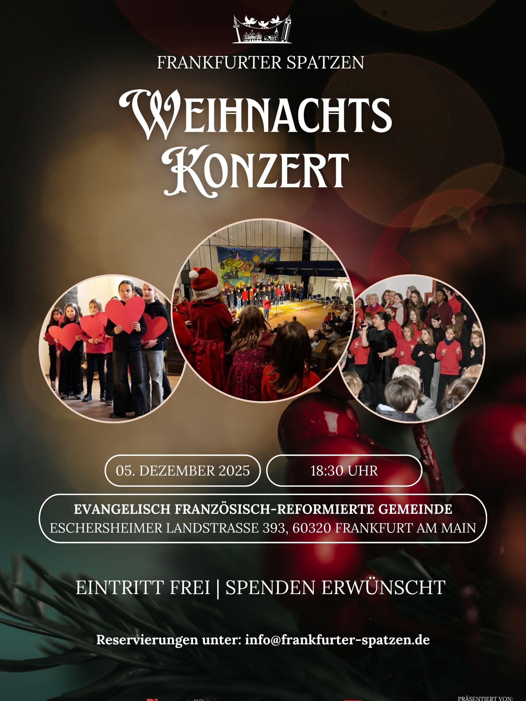 Seid herzlich eingeladen zum Weihnachtskonzert der Frankfurter Spatzen! Am Freitag, 5. Dezember 2025 um 18.30 Uhr in der Evangelischen Französisch-reformierten Gemeinde, Eschersheimer Landstr. 393, Frankfurt. Eintritt frei, Spenden willkommen!